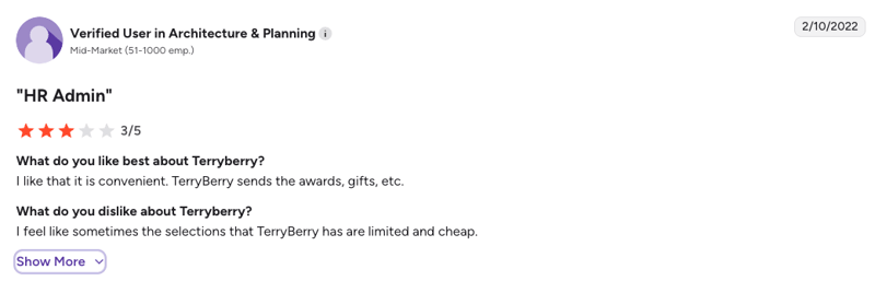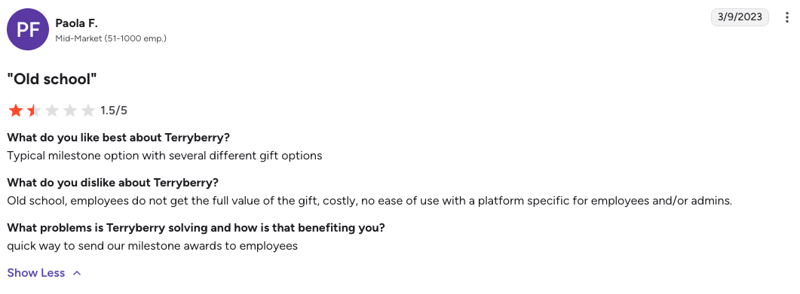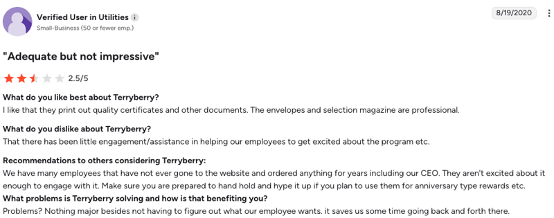 “The gifts that Terryberry offers for Service Recognition needs to be updated and more quality things offered.” – G2 Review